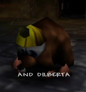 Dilberta is originally found in the Prison Compound of Mayahem Temple. Banjo and Kazooie must help rescue her from the prison by clearing a large rock out of her path and help her return to Bullion Bill in Glitter Gulch Mine. As a reward for saving her, the duo receive a Jiggy.